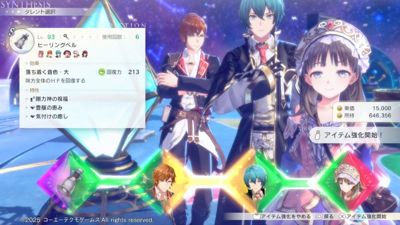 6章のララ&ジェロン戦前のデータで、戦闘不能復活&全状態異常解除できるヒーリングベルが作成できたので記載しておく。