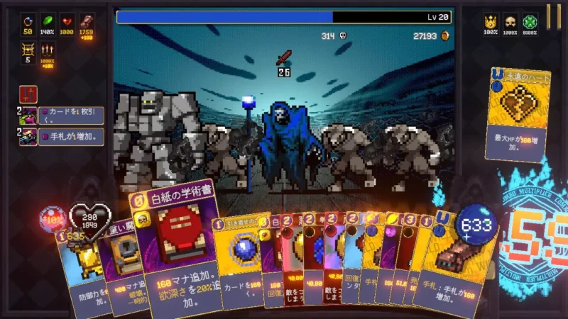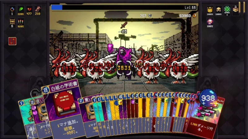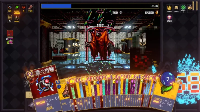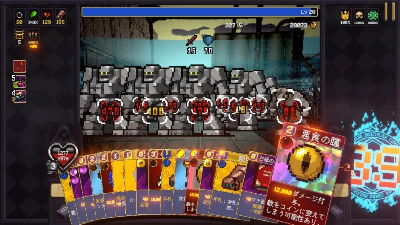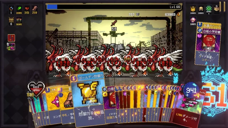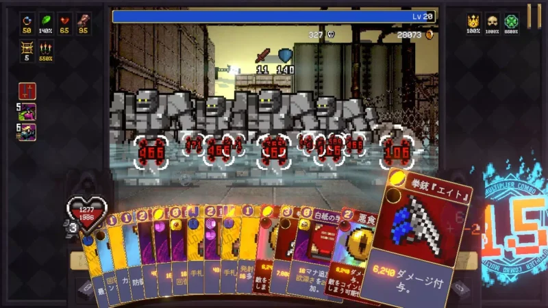 ある程度コンボが繋がったら、ほうれん草や複写の輪を使って攻撃力/発射物弾数を強化しながら、攻撃カードも使ってさらにコンボを繋げていく。