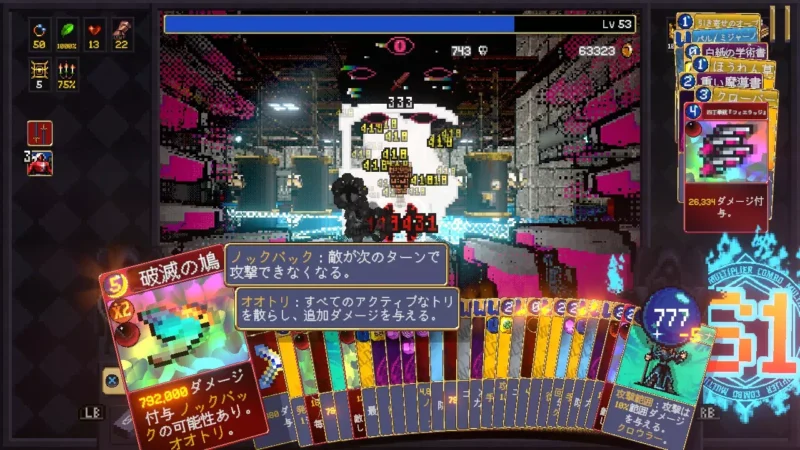 60コンボ越えた辺りで、発射物+50/攻撃力+1000%/ダブルダメージを付けた破滅の鳩で80万近いダメージを出せるようになり、撃破できる。